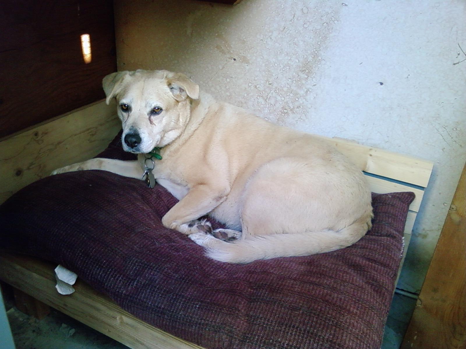Mae, the dog you see at the top of the screen and also here on her custom doggie platform bed is my late dog.